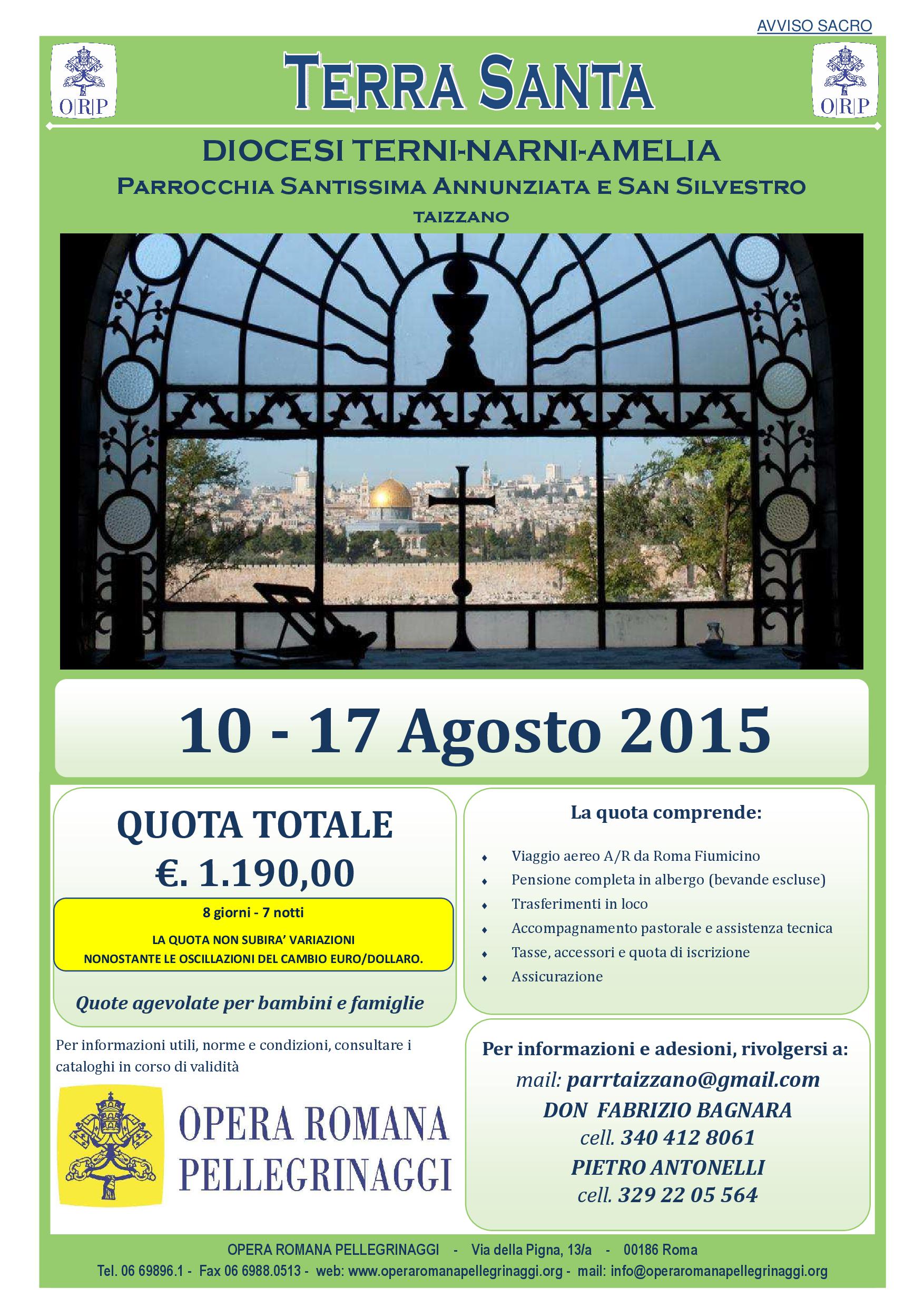 Uncategorized 18 Luglio 2015 redattore Pellegrinaggi in Terra Santa La parrocchia di Otricoli e quella di Taizzano organizzano due pellegrinaggi in Terra Santa curati dall’Opera Romana Pellegrinaggi. Quello di Otricoli è in programma dal 19 al 26 ottobre e quello di Taizzano dal 10 al 17 agosto