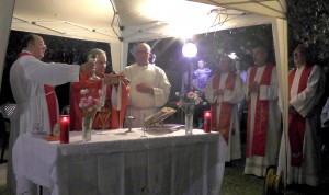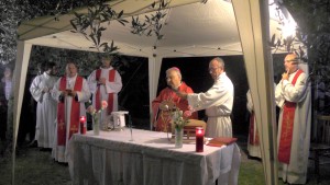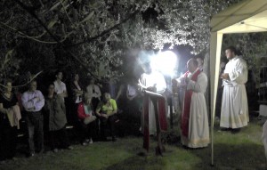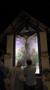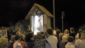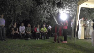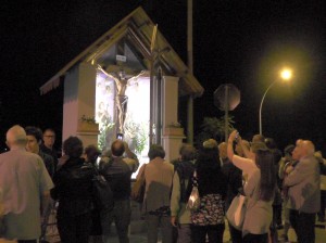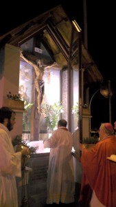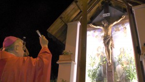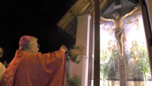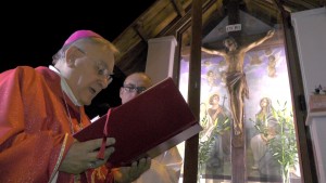 “Vediamo a volte la gente che fa il segno della croce e noi stessi in tante circostanze ci segniamo quando passiamo davanti ad una chiesa o ad una immagine sacra: è il segno dei discepoli del Signore. Questo segno ci deve ricordare l’amore che Gesù ha per noi, compierlo con devozione e con calma senza smorfie. E’ il nostro distintivo di cristiani amati dal Signore che non hanno timore di presentarsi come tali e di dire a  tutti che, in questo segno e in Gesù crocifisso, possiamo trovare la nostra gioia e la nostra salvezza. In questo luogo particolare chiediamo al Signore che ci insegni a guardarlo con fede, che ci insegni a testimoniarlo in ogni momento della nostra vita con il segno della croce, che ci insegni a portare la nostra croce ogni giorno con amore per essere suoi discepoli e conquistare la vita eterna”.