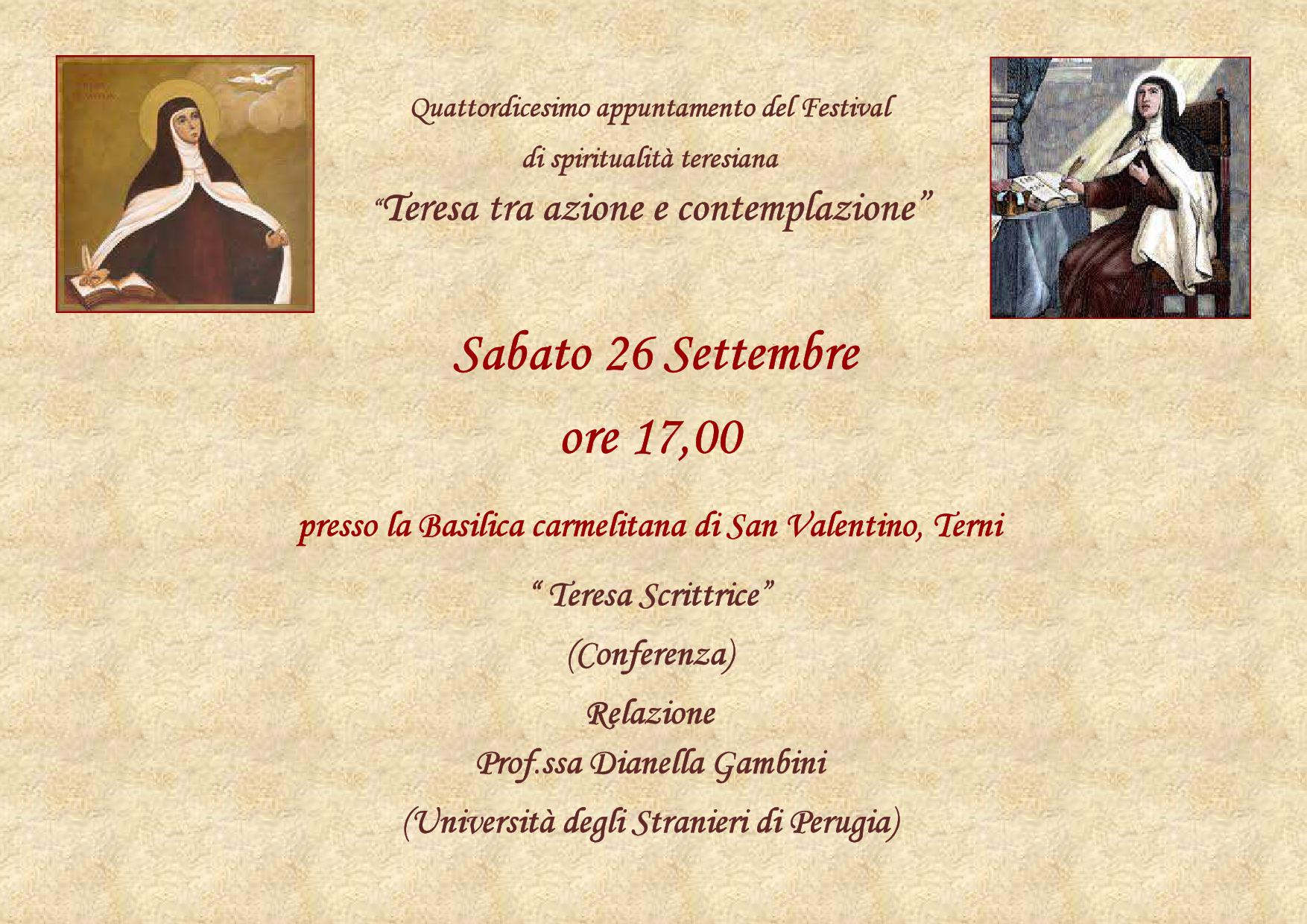 “Teresa scrittrice”, conferenza a cura della prof.ssa Dianella Gambini (Università per gli Stranieri di Perugia), sabato 26 settembre 2015 ore 17,00 presso la Basilica carmelitana di San Valentino Terni