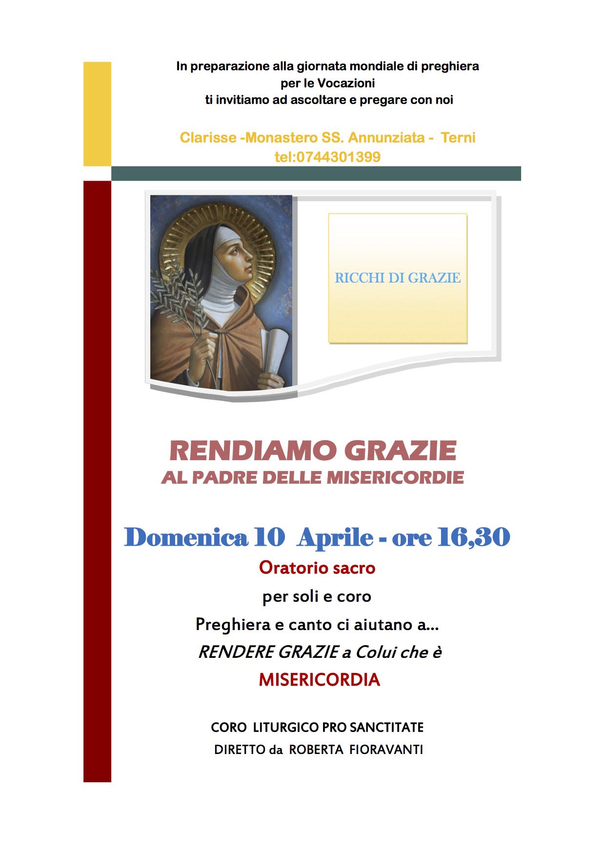 Presso il monastero Santissima Annunziata di Colleluna domenica 10 aprile alle ore 16.30 si terrà il concerto per soli e coro in preparazione alla giornata mondiale di preghiera per le Vocazioni