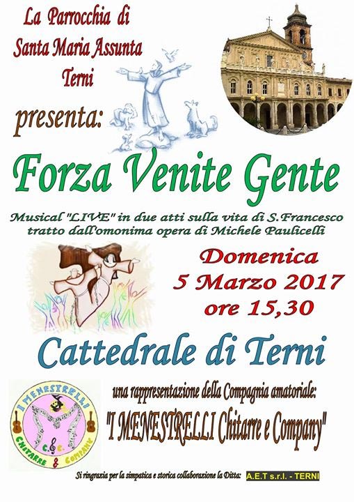 Uncategorized 1 Marzo 2017 redattore Cattedrale di Terni – musical “Forza venite gente” Domenica 5 marzo alle ore 15.30 nella Cattedrale di Terni il musical “Forza Venite Gente”.