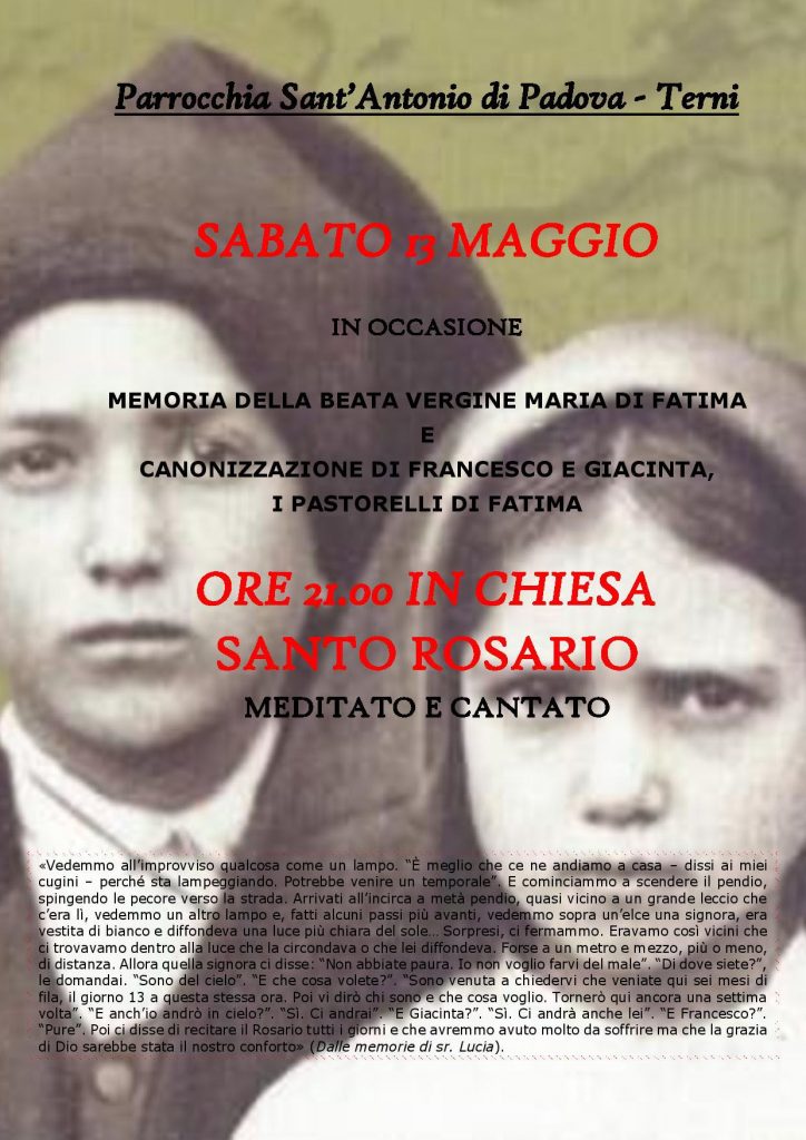 Sabato 13 maggio 2017 alle ore 21,00 nella parrocchia Sant’Antonio di Terni e Santuario Antoniano dei Protomartiri francescani sarà celebrata la festività della Madonna di Fatima e la canonizzazione dei pastorelli Francesco e Giacinta con la preghiera del Santo Rosario cantato e meditato.