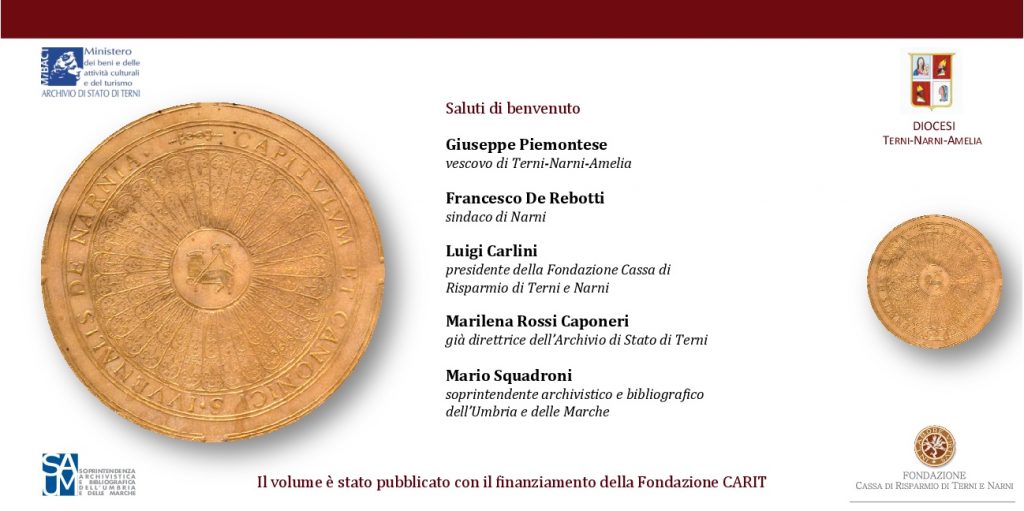 Giovedì 11 maggio 2017 alle ore 16.30 a Narni presso il Centro Diocesano per la Documentazione nel palazzo Vescovile di Narni (piazza Cavour, 8) è stato presentato il volume “Le pergamene dell’archivio del Capitolo della cattedrale di Narni (1047-1941)” a cura di Elisabetta David, Cinzia Perissinotto, Cristiano Carmi, Vladimiro Coronelli.