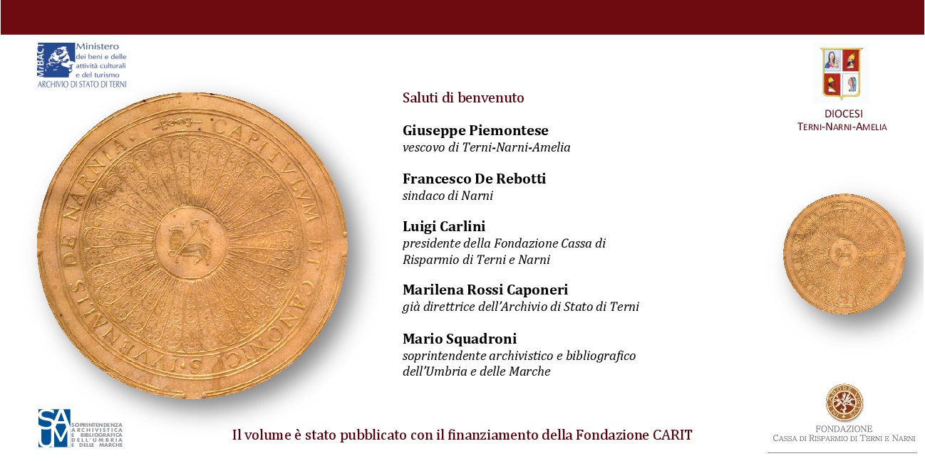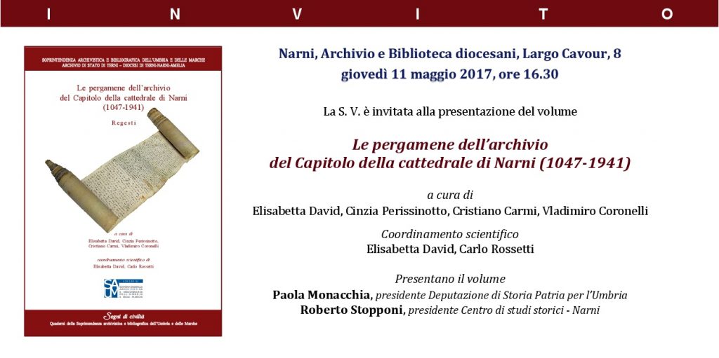 Giovedì 11 maggio 2017 alle ore 16.30 a Narni presso il Centro Diocesano per la Documentazione nel palazzo Vescovile di Narni (piazza Cavour, 8) è stato presentato il volume “Le pergamene dell’archivio del Capitolo della cattedrale di Narni (1047-1941)” a cura di Elisabetta David, Cinzia Perissinotto, Cristiano Carmi, Vladimiro Coronelli.
