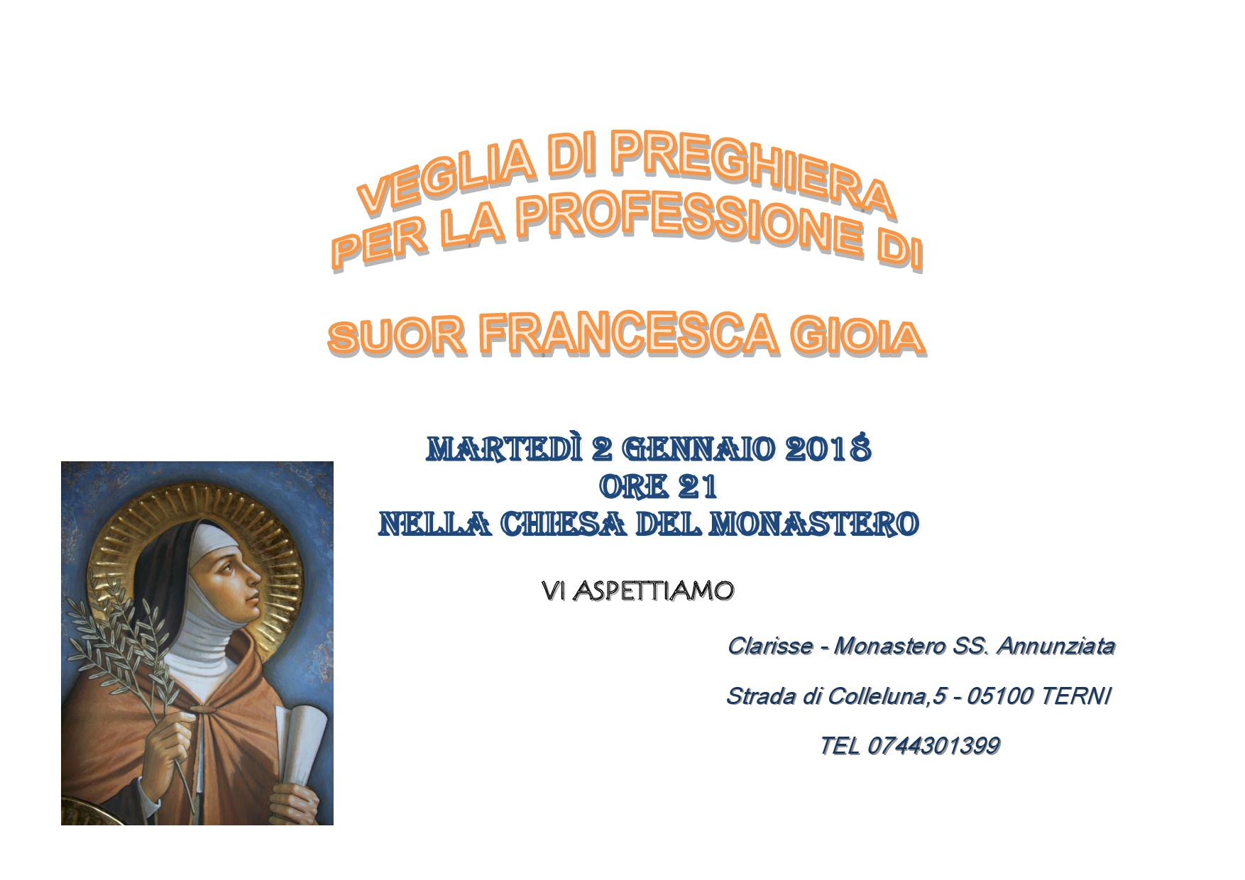 Uncategorized 24 Dicembre 2017 redattore Clarisse – professione suor Francesca Gioia Martedì 2 gennaio alle ore 21 presso il monastero della Santissima Annunziata si terrà la veglia di preghiera per la professione di suor Francesca Gioia
