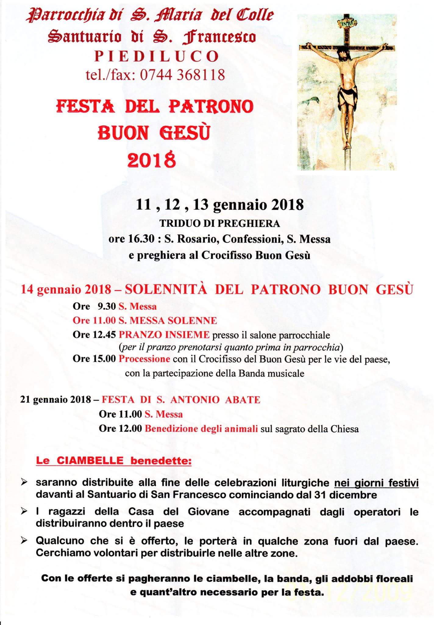 La parrocchia Santa Maria del Colle di Piediluco celebra la festa del Buon Gesù il 14 gennaio alle ore 11 con la messa solenne e a seguire il pranzo nei saloni parrocchiali. Alle ore 15 ci sarà la processione con il Crocifisso del Buon Gesù per le vie del paese, con la partecipazione della Banda di Sangemini.