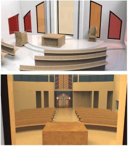 Pertanto dal tabernacolo, si irradiano tutte le linee architettoniche e quelle che hanno dato vita agli arredi della Cappella. Nello specifico, dal presbiterio si irradiano le linee che hanno dato forma al progetto delle panche fino ad arrivare alla nuova disposizione del confessionale, del fonte battesimale ed anche delle stanze per la sacrestia.
