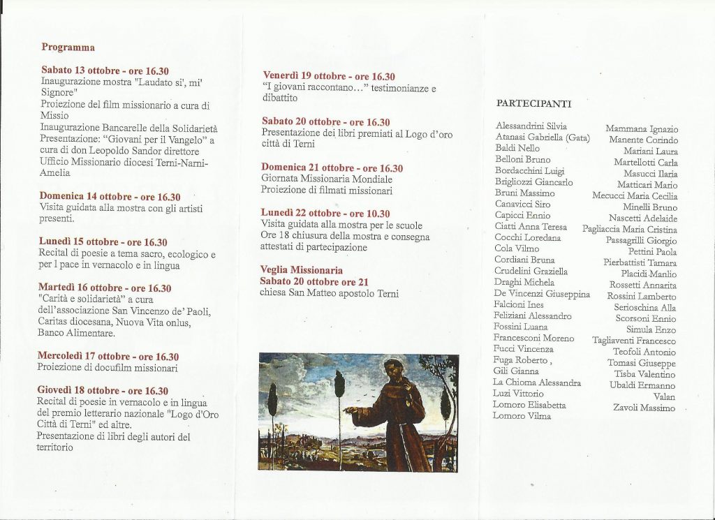 In occasione del mese missionario, dal 13 al 22 ottobre presso le sale espositive del Museo diocesano di Terni è allestita la mostra “Laudato si’ mi’ Signore” di pittura, poesia, fotografie dedicate alle missioni e alla pace. Un‘occasione per aprire una riflessione e conoscenza della ricchezza di esperienze missionarie portate avanti in questo tempo, attraverso la mostra missionaria promossa dal Centro missionario diocesano con il contributo delle tante associazioni che operano in terre di missione, con film e video a testimonianza di coloro che hanno vissuto l’esperienza missionaria ad gentes in varie parti del mondo.