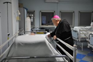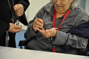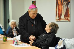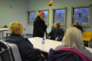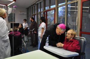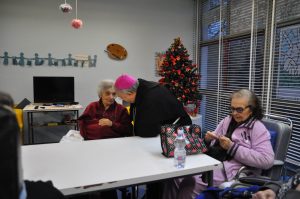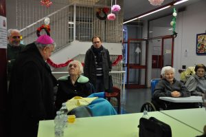Nella seconda giornata della visita pastorale alla parrocchia del Sacro Cuore il vescovo ha incontrato gli anziani e malati e alcuni operatori della struttura residenziale geriatrica “Le Grazie”. Cordiale e commossa l’accoglienza al vescovo che ha salutato personalmente ciascuno, ha pregato con loro, impartito la benedizione e ha donato un rosario ai malati.