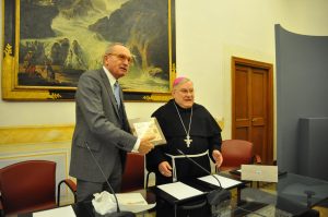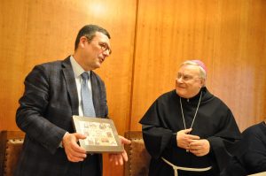 Il vescovo ha quindi donato un quadro con il Cantico delle Creature e il presidente Carlini un volume sulla storia dell’istituzione e della fondazione e cataloghi delle più recenti mostre curate dallo stesso ente.