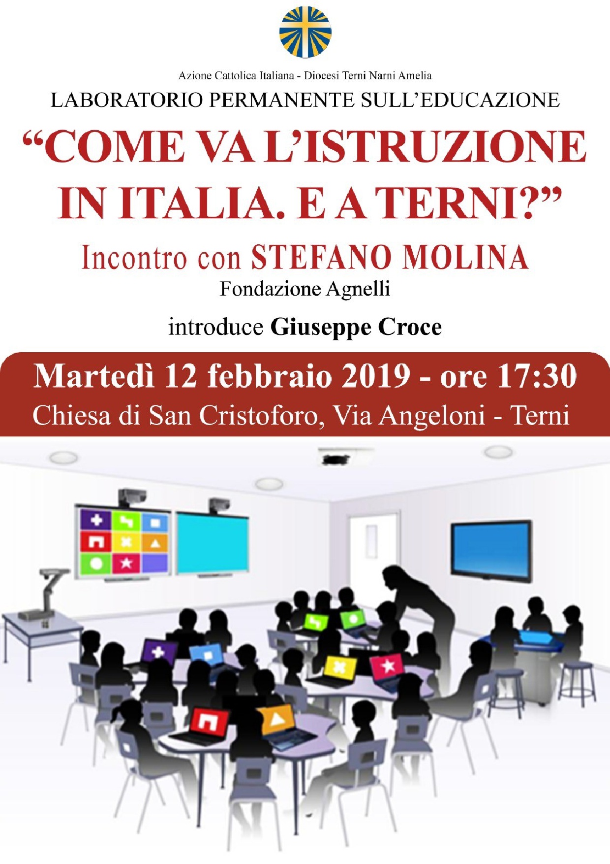 L’Azione Cattolica diocesana nell’ambito del laboratorio permanente sull’educazione, il 12 febbraio 2019 alle ore 17,30 presso la Chiesa di S. Cristoforo in Terni si terrà il convegno: “Come va l’istruzione in Italia ed a Terni?” con l’intervento di Stefano Molina, dirigente di ricerca presso la fondazione Giovanni Agnelli.