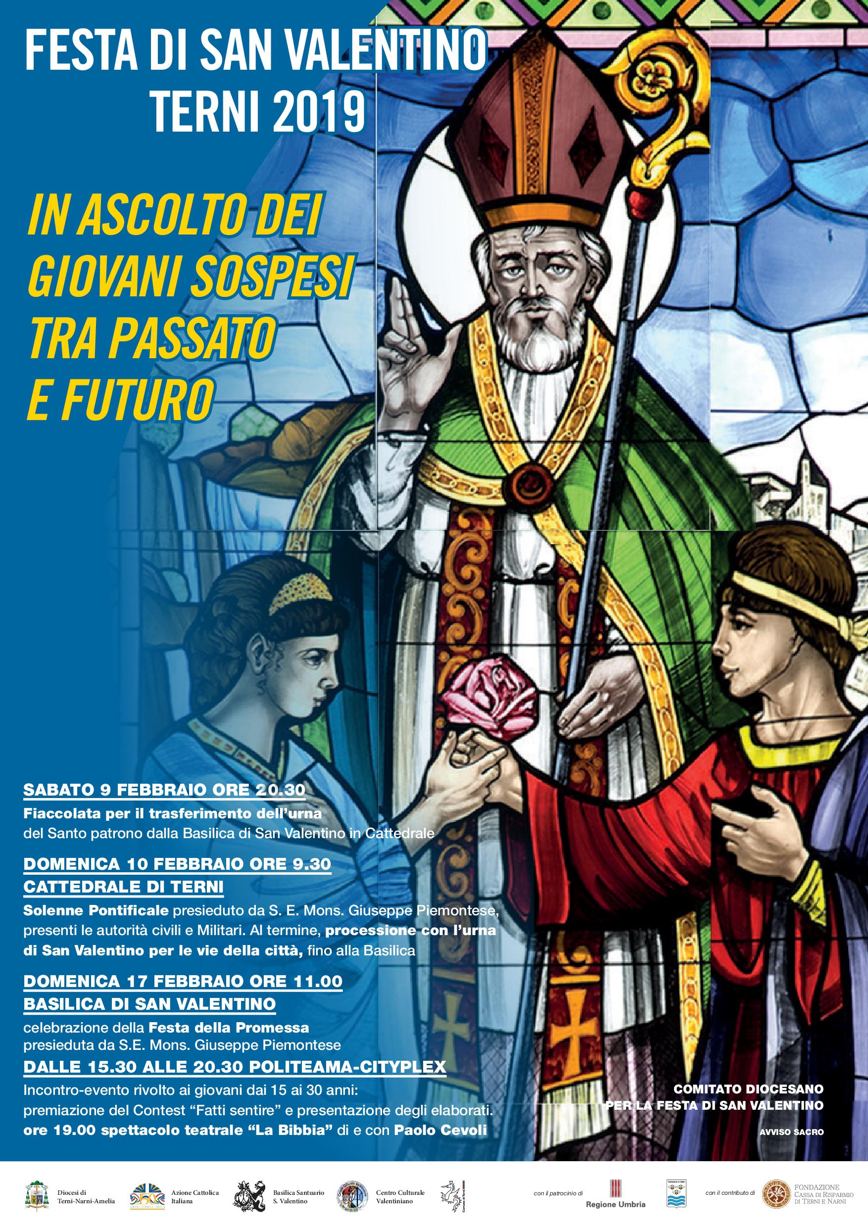 Ai giovani è dedicato il contest “Fatti sentire” promosso dal Servizio di Pastorale Giovanile, e i giovani saranno i protagonisti della fiaccolata del 9 febbraio per il trasferimento dell’urna del Santo patrono dalla basilica di San Valentino in Cattedrale. La processione si snoderà lungo via Papa Zaccaria, via San Valentino, via Serrati, via Turati, Obelisco Lancia di Luce, corso del Popolo, via dell’Annunziata, piazza Briccialdi, via del Vescovado, Cattedrale.