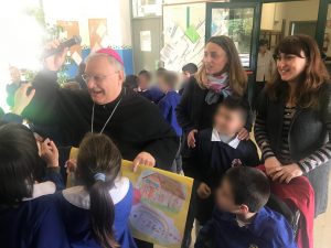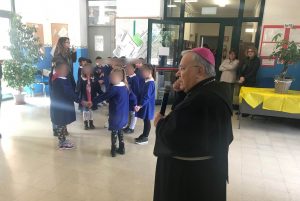 I bambini della scuola primaria hanno accolto il vescovo con un canto sulla pace e hanno donato dei cartelloni da loro realizzati, raffiguranti la scuola e messaggi di benvenuto. Il vescovo ha poi risposto alle domande dei bambini parlando della sua vocazione, della sua missione e della sua esperienza al Sacro Convento di Assisi.