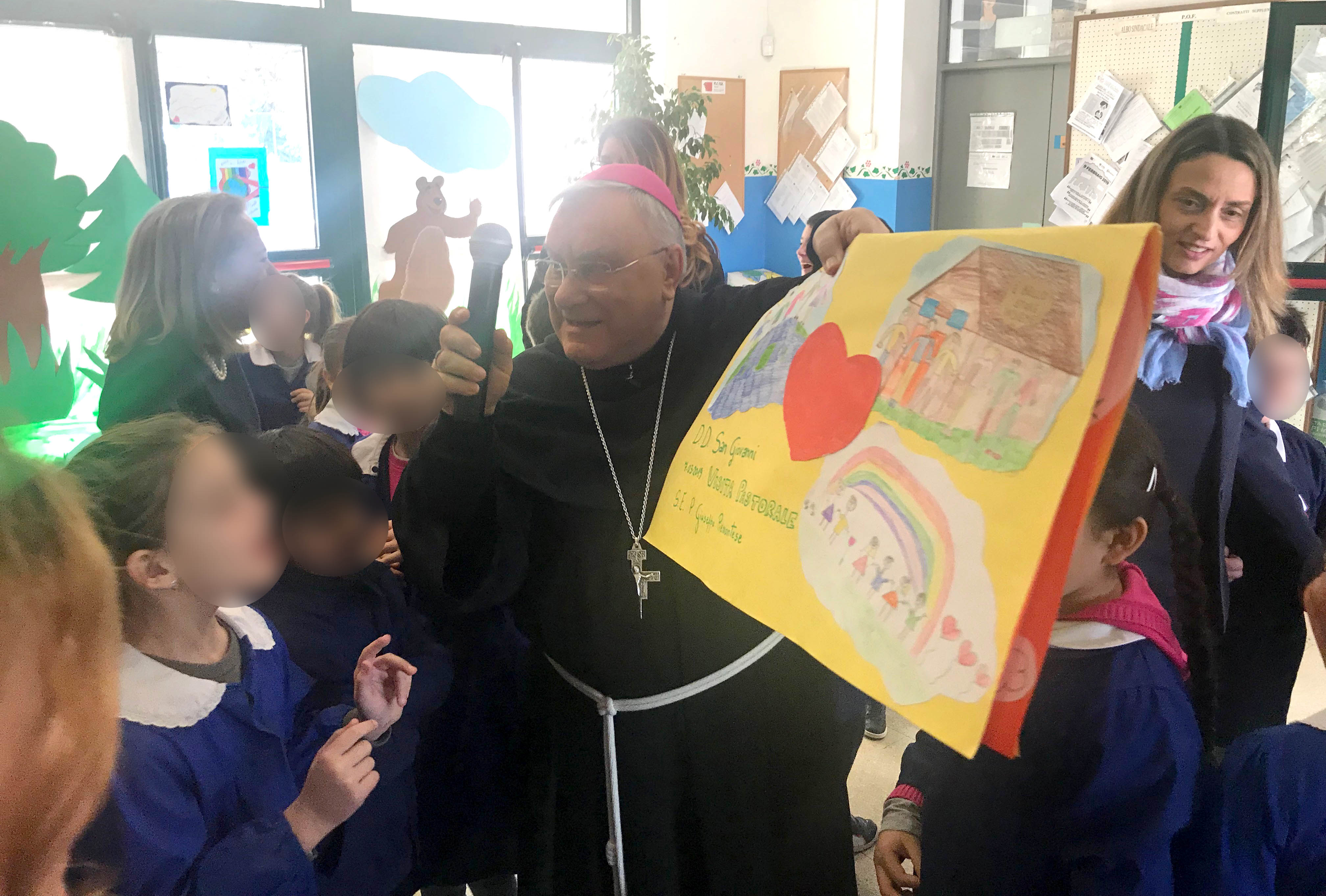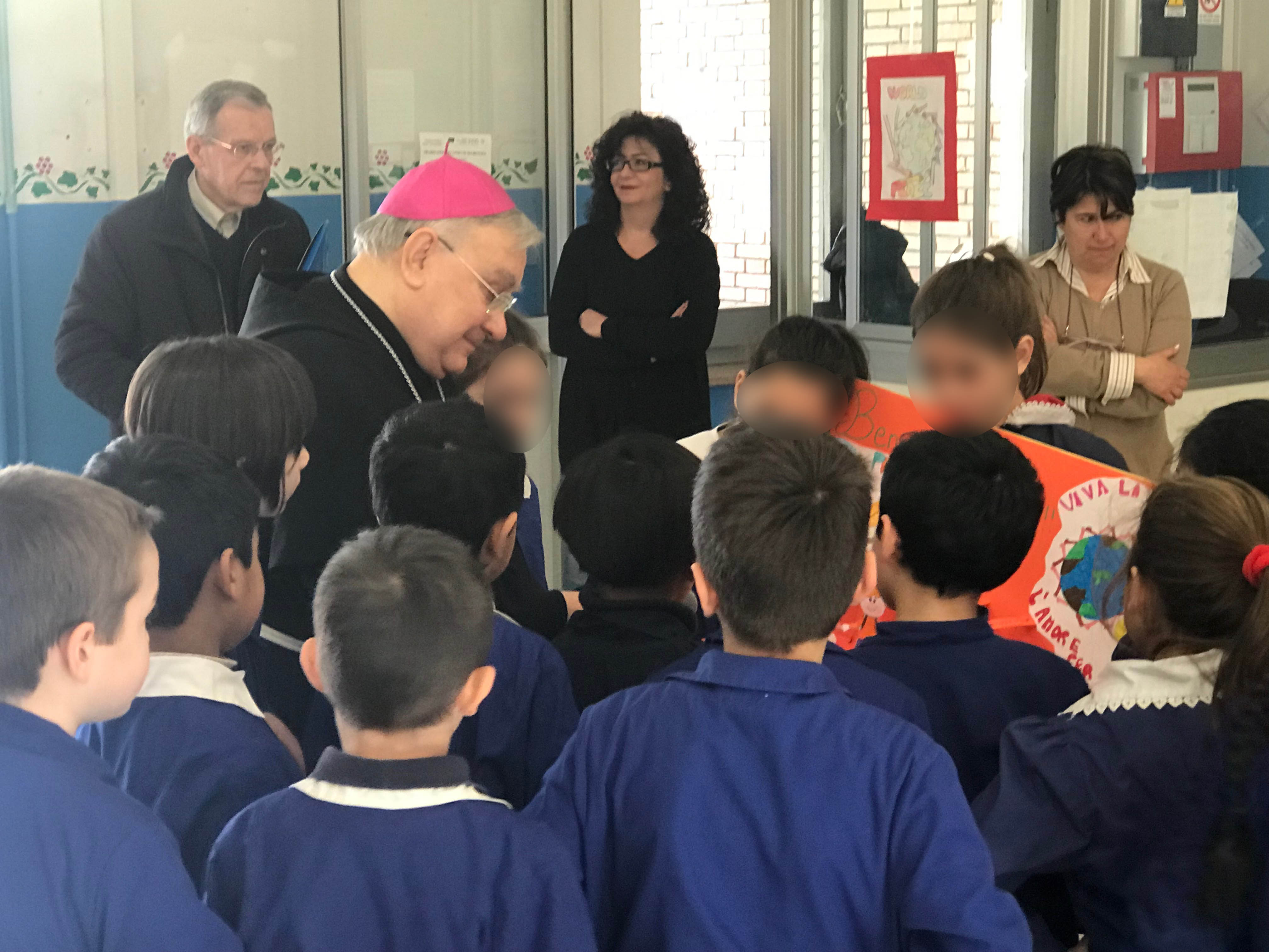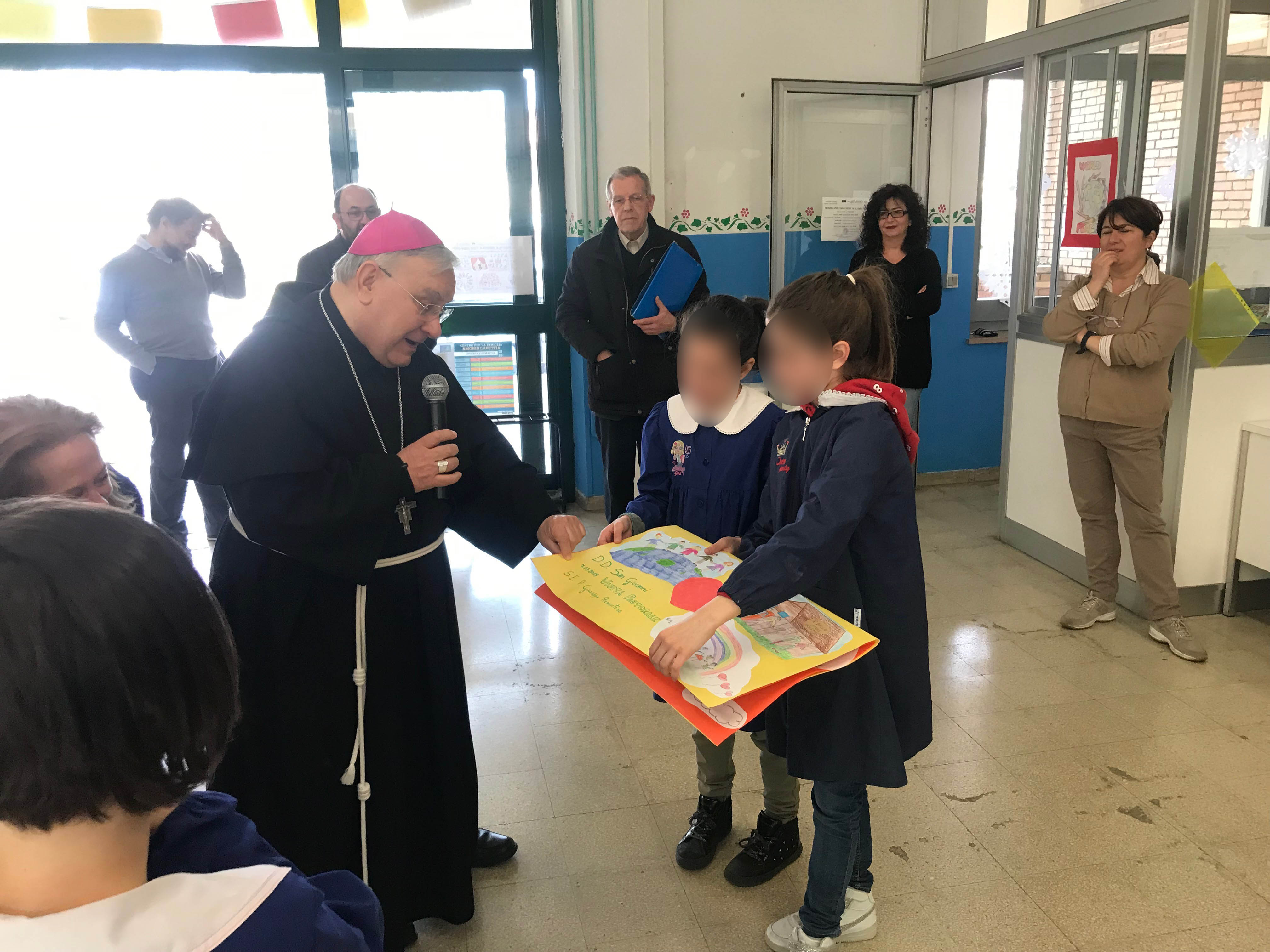 I bambini della scuola primaria hanno accolto il vescovo con un canto sulla pace e hanno donato dei cartelloni da loro realizzati, raffiguranti la scuola e messaggi di benvenuto. Il vescovo ha poi risposto alle domande dei bambini parlando della sua vocazione, della sua missione e della sua esperienza al Sacro Convento di Assisi.