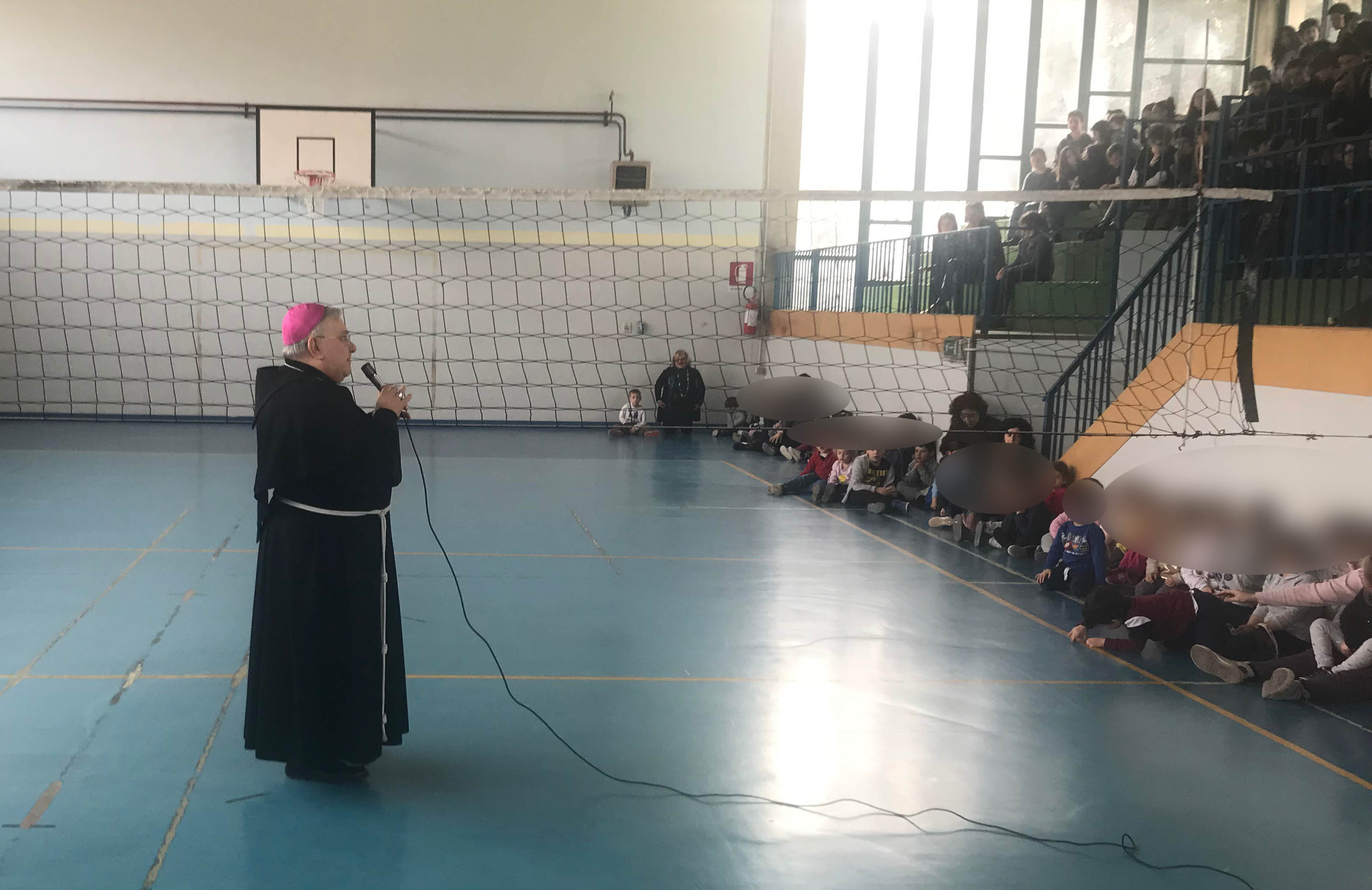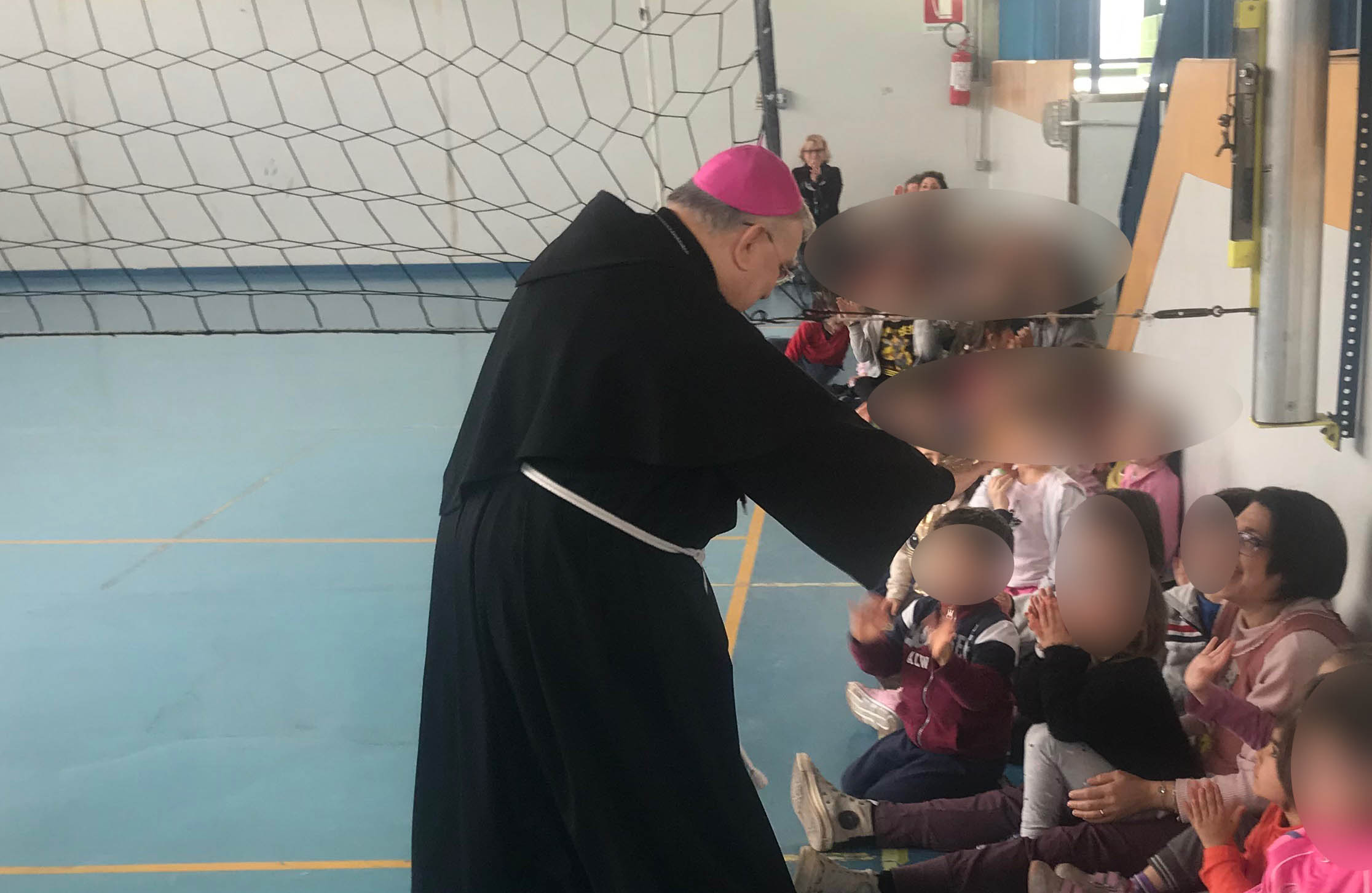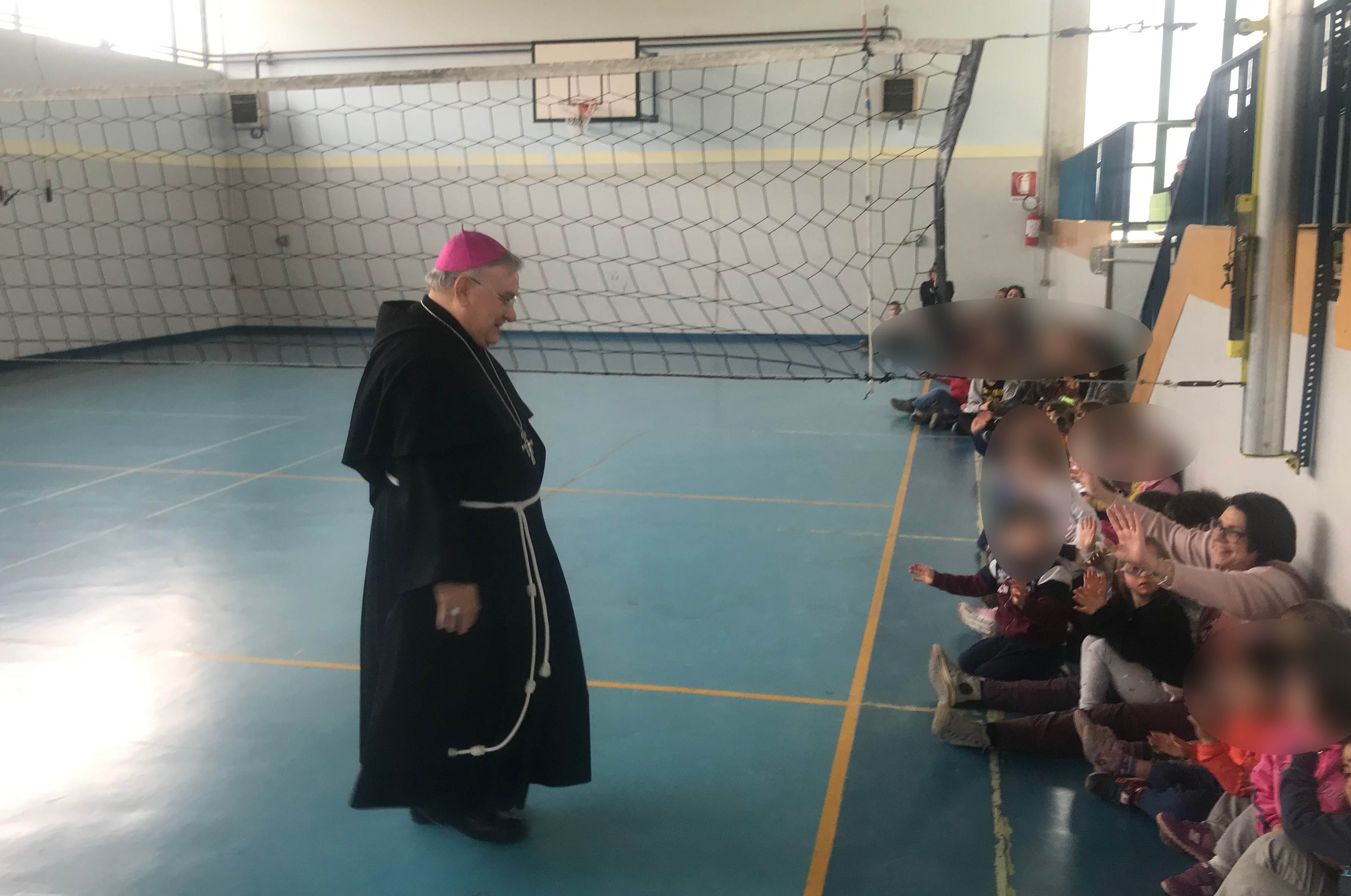 I bambini della scuola primaria hanno accolto il vescovo con un canto sulla pace e hanno donato dei cartelloni da loro realizzati, raffiguranti la scuola e messaggi di benvenuto. Il vescovo ha poi risposto alle domande dei bambini parlando della sua vocazione, della sua missione e della sua esperienza al Sacro Convento di Assisi.