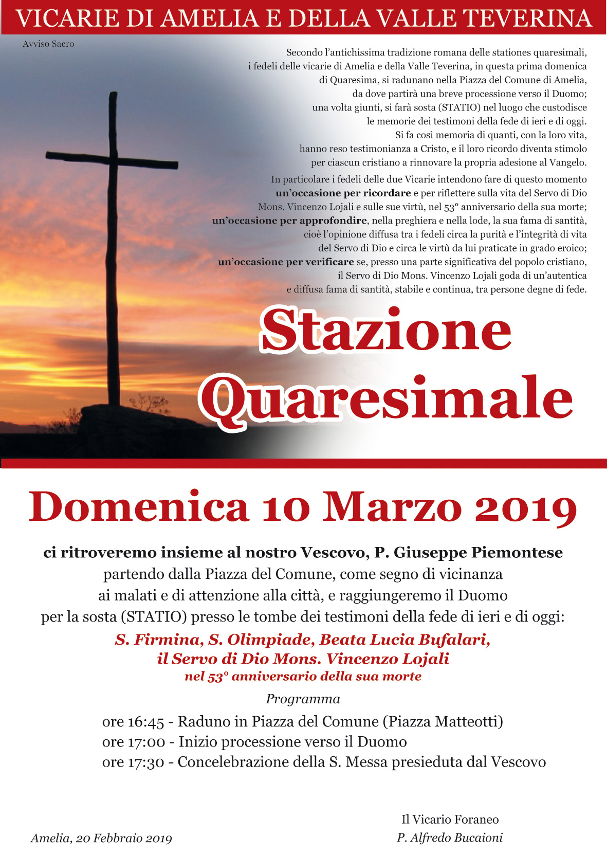 Domenica 10 marzo 2019 sarà celebrata la stazione quaresimale delle Vicarie di Amelia e della Valle Teverina. La partenza della processione alle ore 17 dalla piazza del Comune (Piazza Matteotti) come segno di vicinanza ai malati e di attenzione alla città, raggiungerà il Duomo per la sosta presso le tombe dei testimoni della fede di ieri e di oggi S. Firmina, S. Olimpiade, Beata Lucia Bufalari, il Servo di Dio Mons. Vincenzo Lojali nel 53° anniversario della sua morte. Nella concattedrale di Amelia alle ore 17.30 ci sarà la concelebrazione presieduta dal Vescovo Giuseppe Piemontese.
