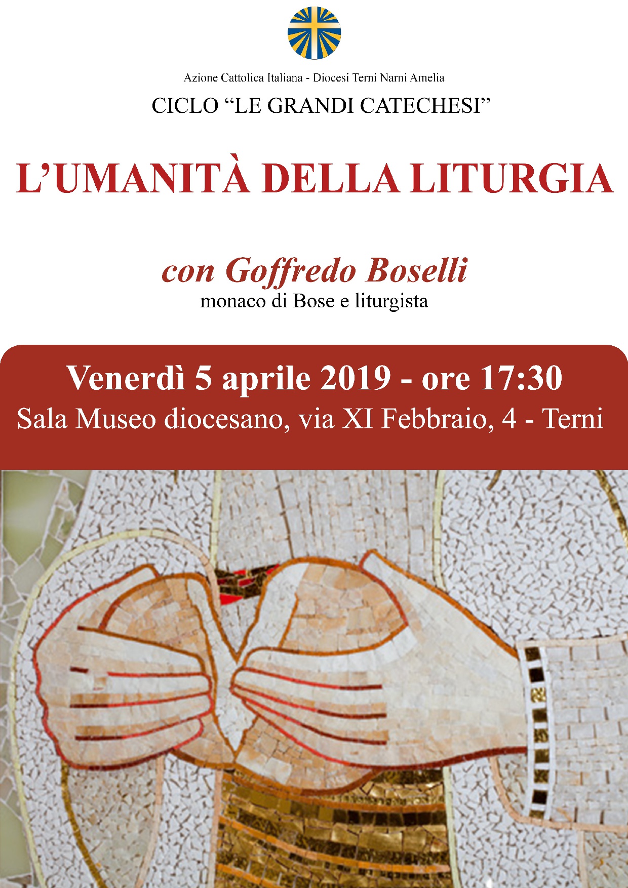 Venerdì 5 aprile dalle ore 17.30 alle 19.30 presso la sala conferenze del Museo diocesano di Terni, nell’ambito delle “Grandi catechesi”, si terrà l’incontro con Goffredo Boselli monaco della Comunità di Bose che parlerà di: “L’umanità della Liturgia”.