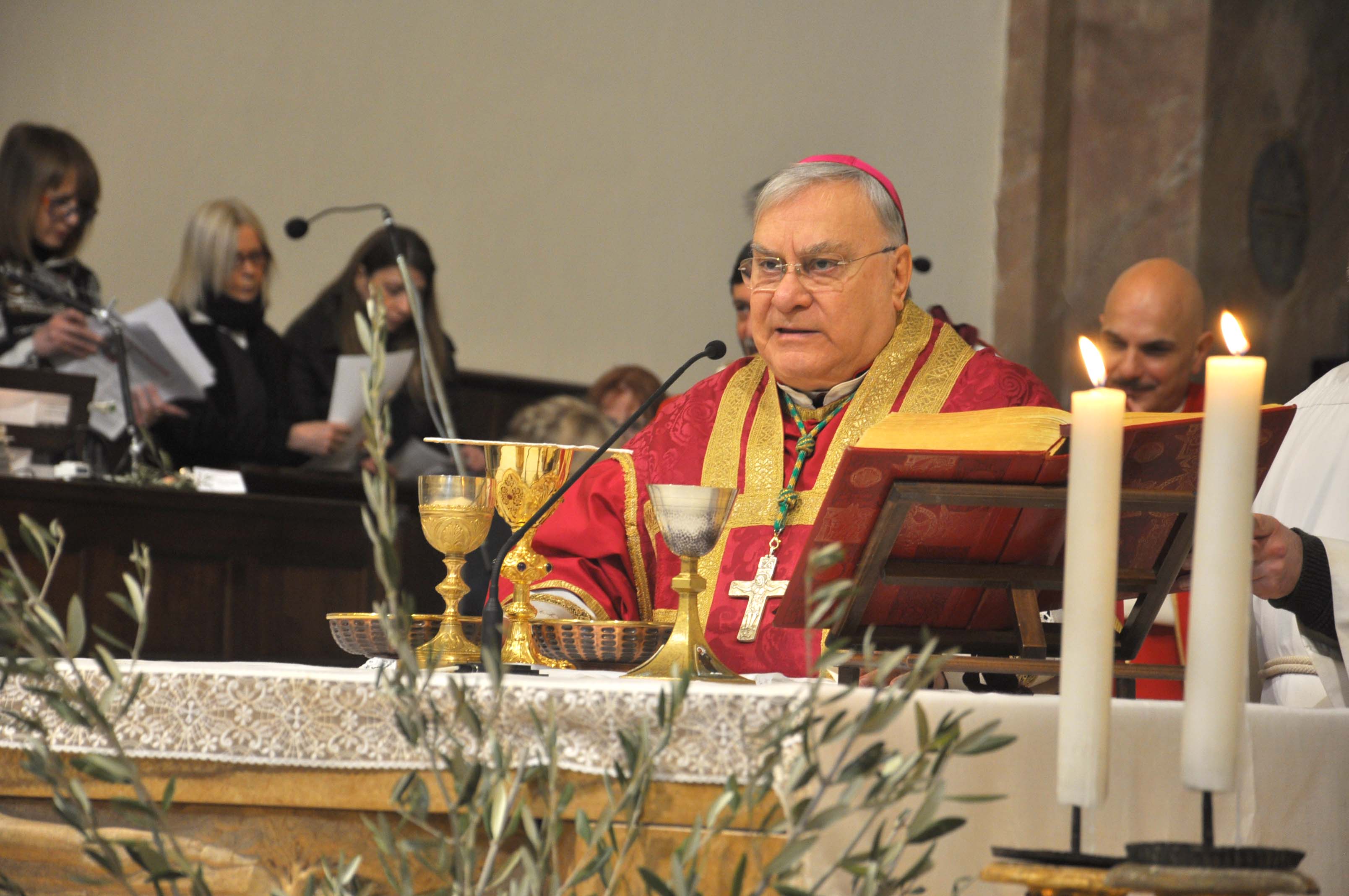 “Abbiamo percorso il cammino di fede dietro Gesù che ha permesso in quel giorno delle palme che lo acclamassero re e Messia – ha ricordato il vescovo -. La messa che dà inizio alla settimana santa, ai giorni santi della passione morte e risurrezione del Signore è preceduta dalla benedizione delle palme e dalla processione con le palme per commemorare l’ingresso di Gesù in Gerusalemme. Abbiamo assistito, ascoltato, partecipato al racconto della passione, della morte di Gesù. Questi due elementi: la gioia e la passione sono due elementi che fanno parte della vita cristiana, che ha vissuto Gesù e che viviamo anche noi. Il vangelo di Luca ci vuol dire che Gesù nella vita è stato circondato ha cercato i poveri, ha cercato i peccatori, alla sua nascita è stato circondato dai pastori, gente che non veniva considerata, durante la sua vita ha cercato i pubblicani, i peccatori, le prostitute per dare loro una speranza e una consolazione. Dalla passione della morte di Gesù noi riceviamo misericordia, perché non sappiamo quello che facciamo quando ci dedichiamo al peccato. Oggi chiediamo al Signore che ci aiuti ad affidarci sempre alla sua misericordia, a non disperare mai, perché Gesù è venuto, si è fatto pane per noi, è venuto per accompagnarci in paradiso”.