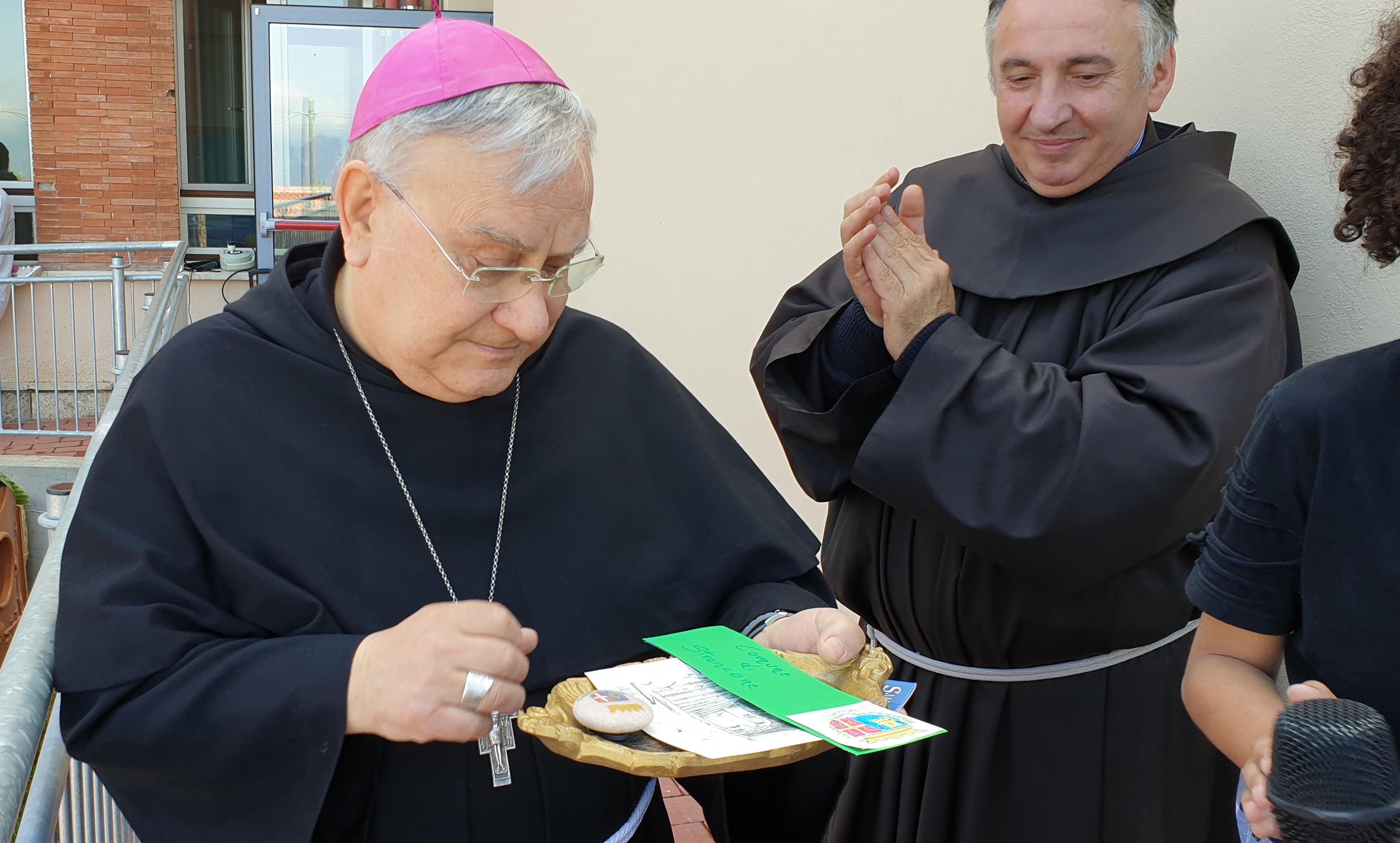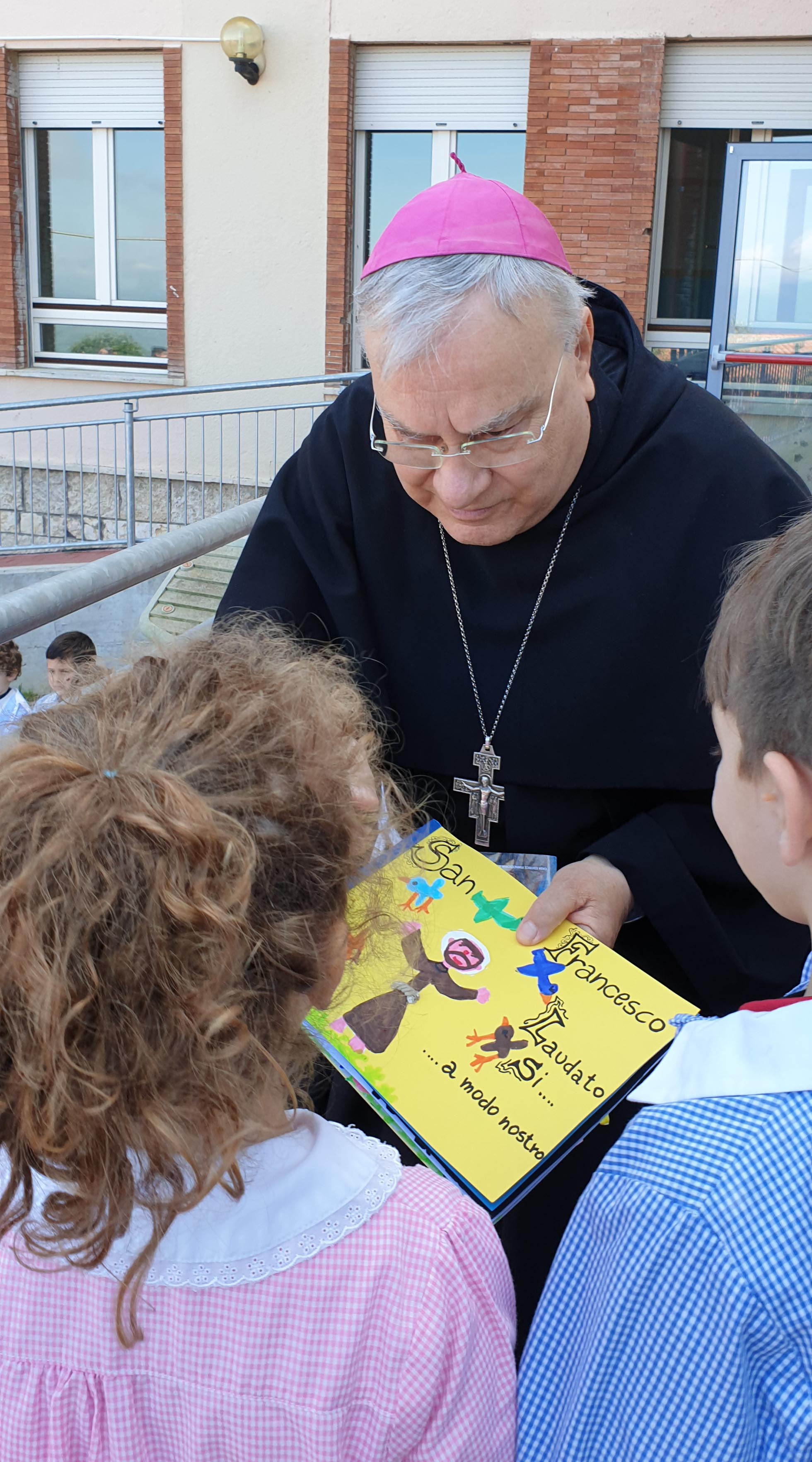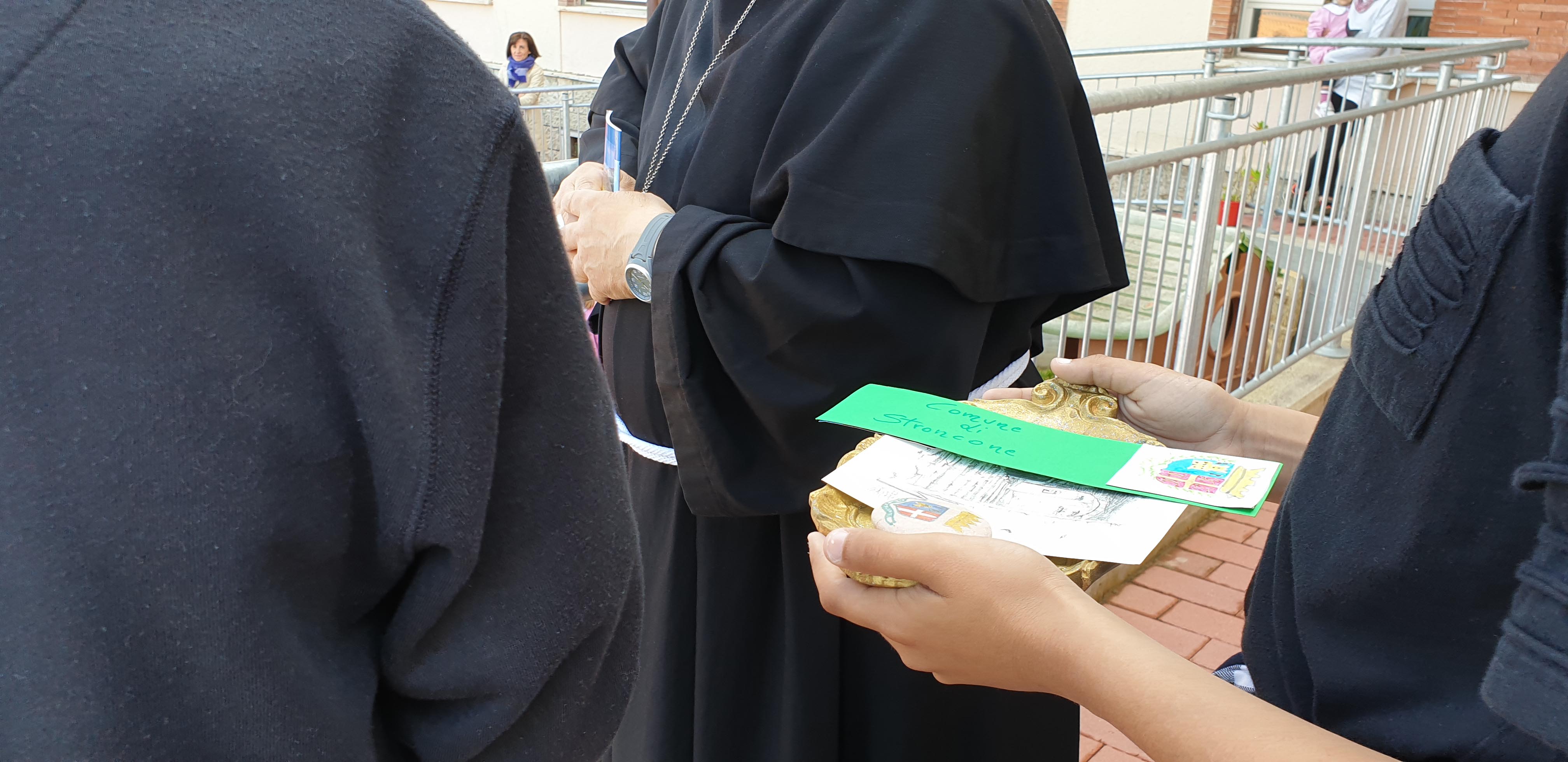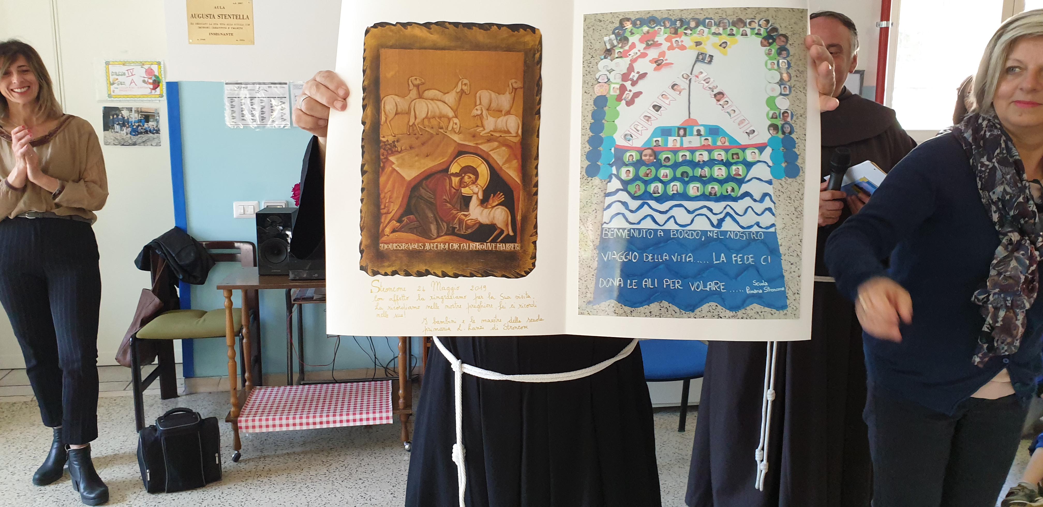 I ragazzi hanno donato al vescovo degli oggetti da loro realizzati e dei disegni raffiguranti il paese di Stroncone e il suo stemma, mentre i bambini della scuola dell’infanzia hanno donato una raccolta di disegni raffiguranti alcuni brani del Cantico delle Creature di San Francesco.