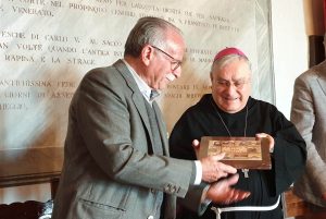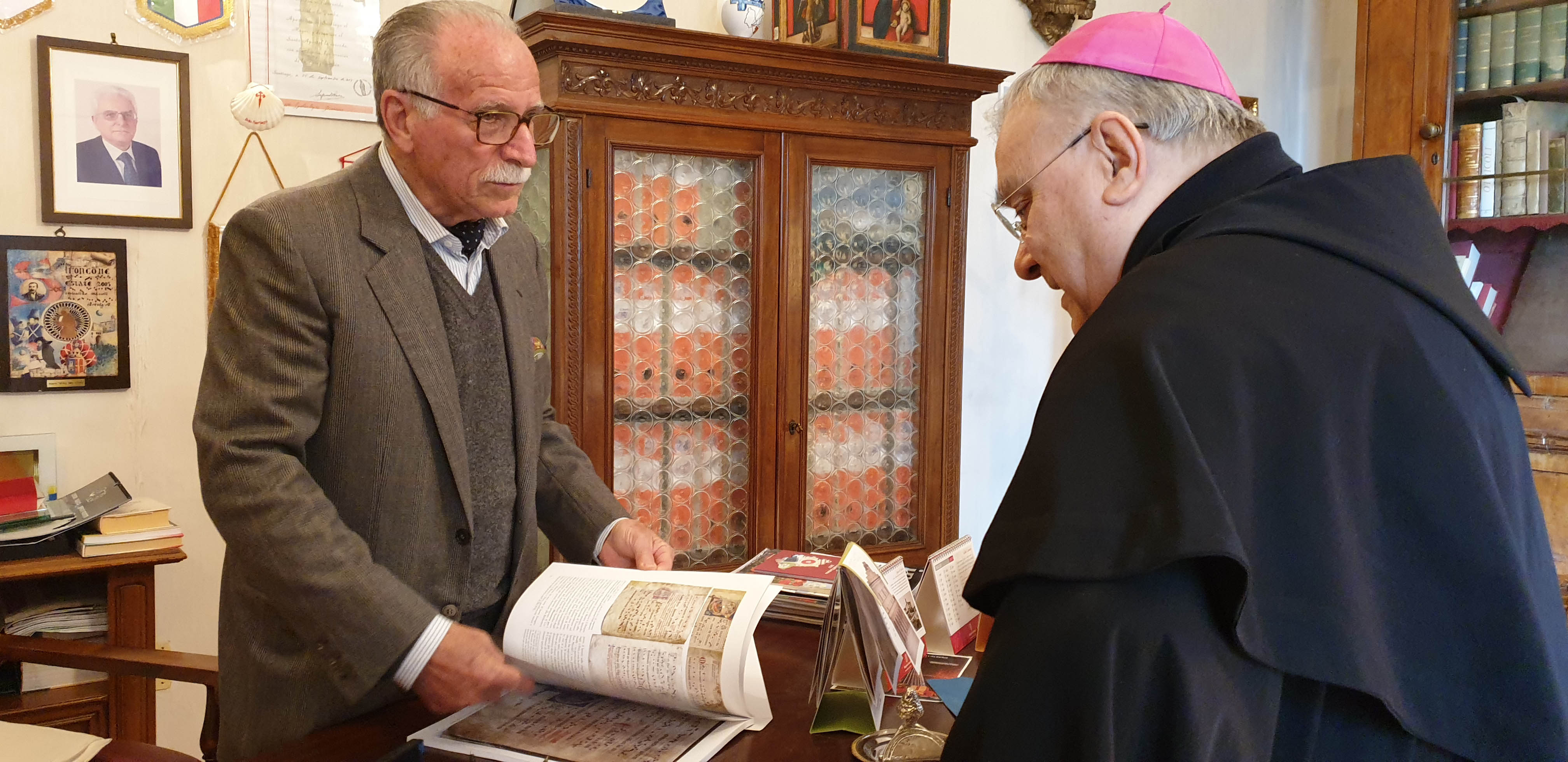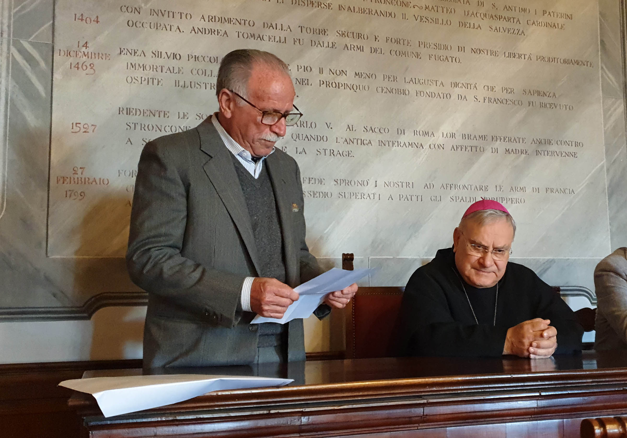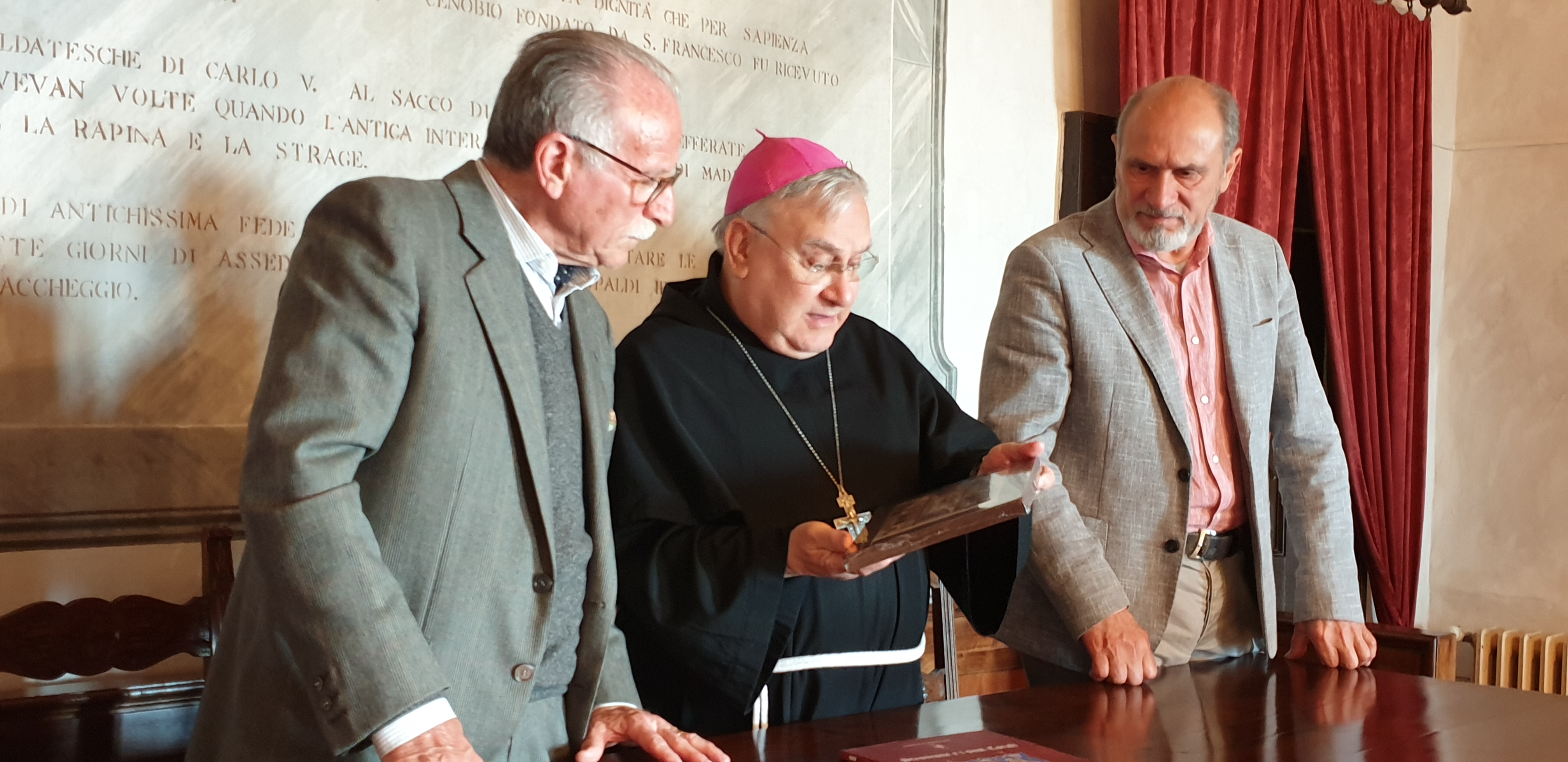 Il sindaco ha donato al vescovo il libro che raccoglie “I corali di Stroncone” a carattere liturgico-musicale alcuni rislenti al XIV sec., mentre il vescovo ha donato, a ricordo della visita, un quadro con il testo del Cantico delle Creature di San Francesco.