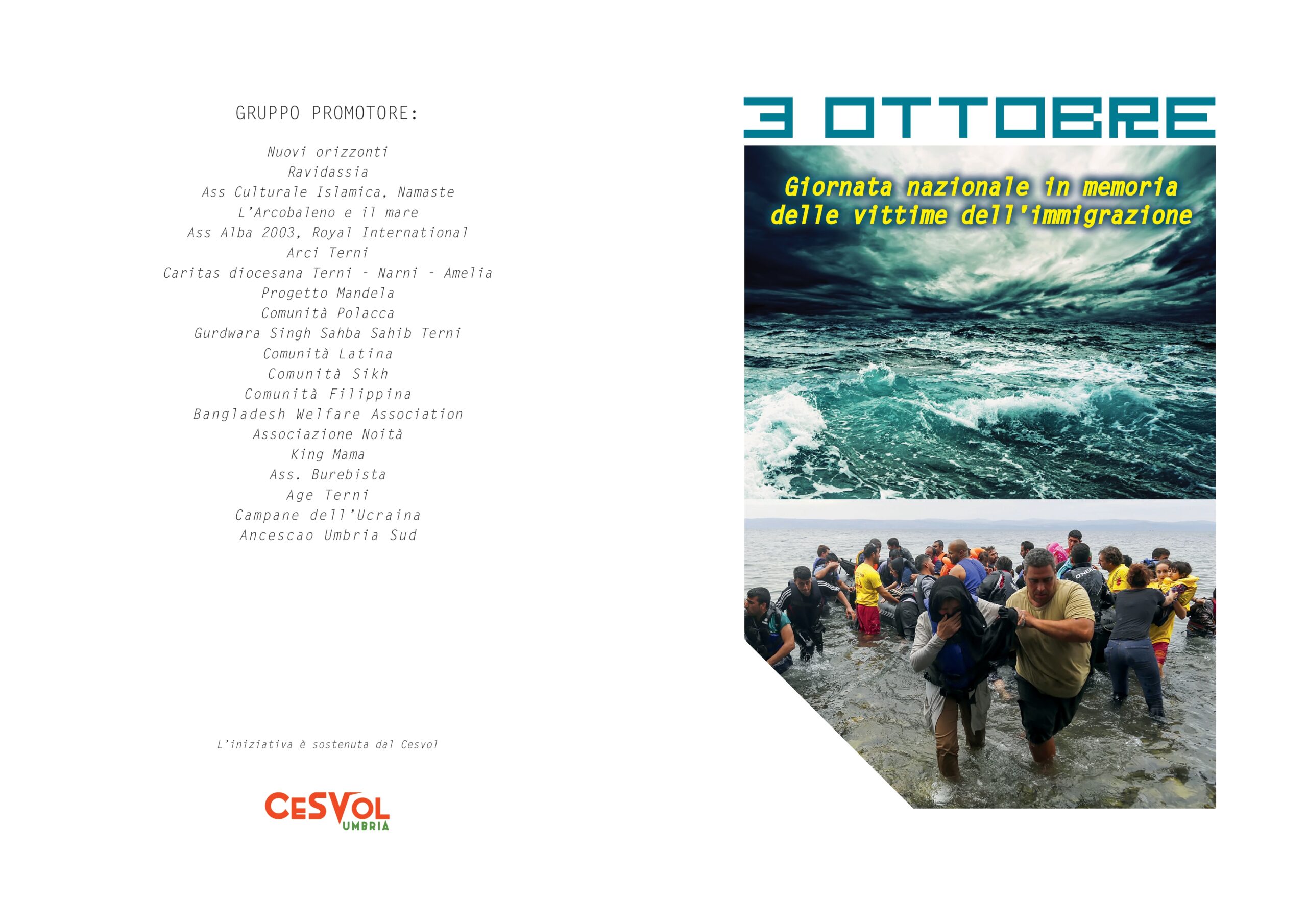 Lunedì 3 ottobre, alle 17, in piazza della Pace (in caso di maltempo nella sala polivalente del Cesvol, in via Montefiorino, a Cospea) si terrà un incontro commemorativo con gli interventi dei rappresentanti delle associazioni promotrici: Nuovi orizzonti, Ravidassia, Associazione Culturale Islamica, Namaste, L’Arcobaleno e il mare, Alba 2003, Royal International, Arci Terni, Caritas diocesana Terni-Narni-Amelia, Progetto Mandela, Comunità Polacca, Gurdwara Singh Sahba Sahib Terni, Comunità Latina, Comunità Sikh, Comunità Filippina, Bangladesh Welfare