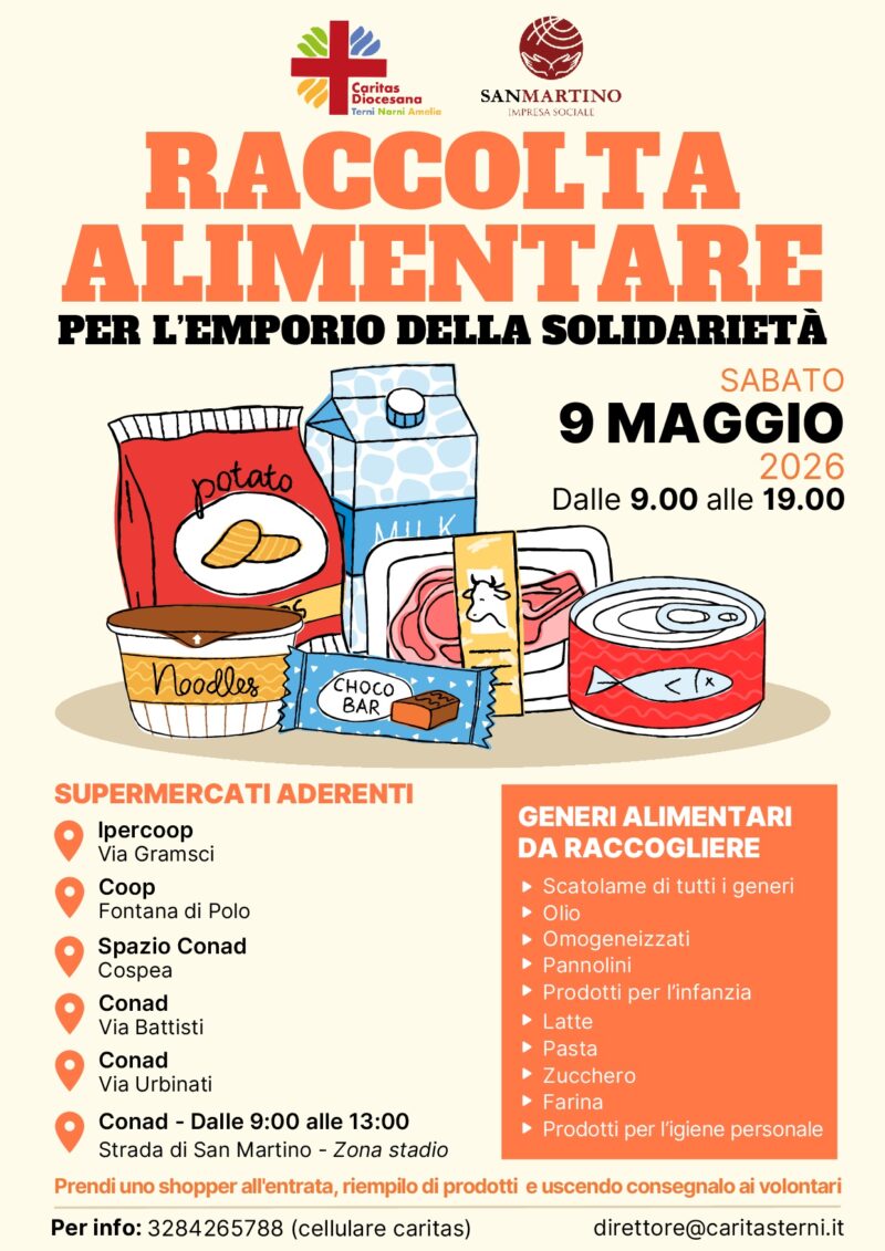 Sabato 9 maggio dalle 9 alle 19 si terrà nei supermercati di Terni la raccolta alimentare, promossa dalla Caritas diocesana e San Martino impresa sociale, per sostenere l’attività dell’emporio solidale di Terni, presso il centro di ascolto di via Vollusiano, per incrementare la disponibilità di beni di prima necessità a sostegno delle famiglie più in difficoltà del territorio. La raccolta alimentare non è solo un … Continua a leggere A Terni raccolta per l’emporio della solidarietà il 9 maggio